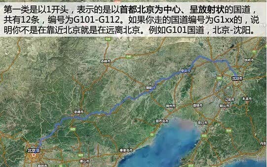 这三类中,其中1表示的是以首都北京为中心、呈放射状的国道,共有12条,编号为G101-G112。所以如果平时你在路上走的国道编号为G1xx的,则说明你不是在靠近北京就是在远离北京。