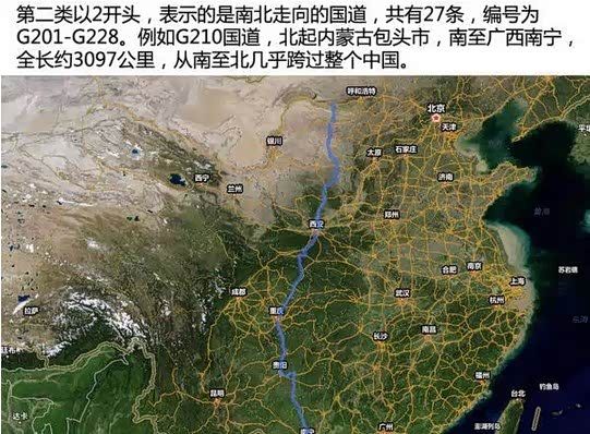 数字2表示的是南北走向的国道,共有27条,编号为G201-G228。看到这可能眼尖的童鞋会问,G201-G228不是有28条吗?怎么才27条?是的,本来南北走向的国道一共是有28条,不过后来起点为云南楚雄,终点为云南墨江G226国道被取消了,于是就变成了现在的27条。