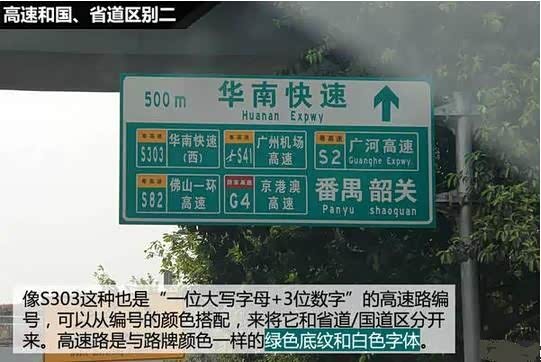 有些高速公路也有用“一位大写字母+3位数字”的编号,那这个时候应该怎么来区别它是高速公路还是省道/国道呢?这种情况我们就要看它路牌上编号的颜色搭配。高速公路的路牌编号配色是跟路牌颜色一样的绿色底纹和白色字体。