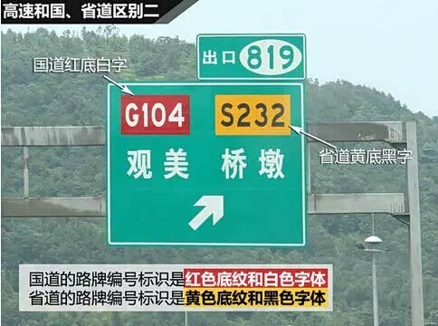 国道的路牌编号配色是红色底纹和白色字体,省道的路牌编号配色是黄色底纹和黑色字体。一般情况下,通过看编号就可以直接区分出是高速路还是国道,但如果在特殊情况下,可以通过快速瞄一眼路牌上编号的颜色来快速区分。