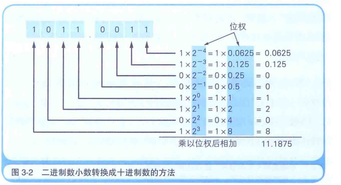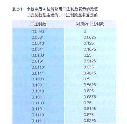 图3-2是小数点后四位能够用二进制数表示的数值范围为0.0000~0.1111(二进制数是连续的,十进制数是非连贯的)。所以这里只能表示0.5、0.25、0.125、0.0625这四个二进制数小数点后面的位权组合而成(相加总和)的小数。将这些数值组合后能够表示的数值,即表3-1中所示的无序的十进制数。