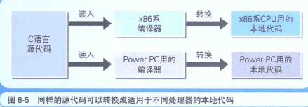 因而,编译器不仅和编程语言的种类有关,和 CPU 的类型也是相关的。例如,Pentium等x86 系列 CPU用的C编译器,同PowerPC 这种CPU用的C编译器就不同。因为这样一来,同样的源代码就可以翻译成适用于不同 CPU 的本地代码了(图 8-5)。