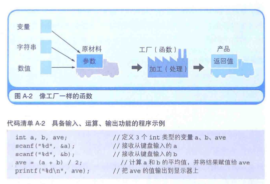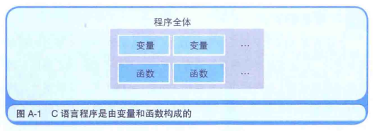 变量和函数:不管使用什么样的编程语言,程序内容都是由数据和处理构成的至于程序的数据和处理具体该如何表示,则根据编程语言的不同而不同。在 C语言中,数据用变量来表示,处理用函数来表示。因而,语言的程序就是由变量和函数构成的(图 A-1)。