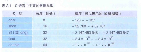 程序变量则受位数和精度的限制。这是因为,计算机的存储容量是有限的。计算机中预先被定义过的位数和精度称为数据类型。C 语言中主要的数据类型如表 A-1 所示。其中,Char、short、int 是整数用的数据类型float 和 double 是小数用的数据类型。