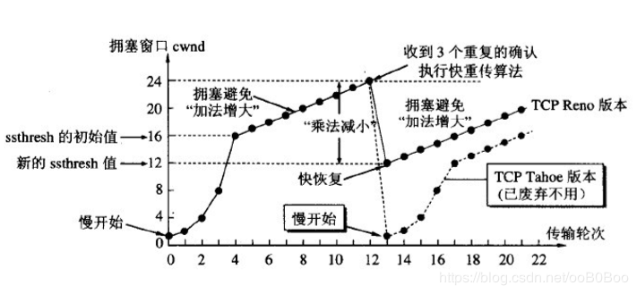 快速恢复: 1. 当发送方连续收到三个重复确认时,就执行“乘法减小”算法,把ssthresh门限减半。 但是接下去并不执行慢开始算法。 2. 考虑到如果网络出现拥塞的话就不会收到好几个重复的确认,所以发送方现在认为网络可能没有出现拥塞。所以此时不执行慢开始算法,而是将cwnd设置为ssthresh的大小, 然后执行拥塞避免算法。