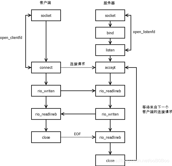 服务端函数调用顺序:socket、bind、listen、accept、read/write、close