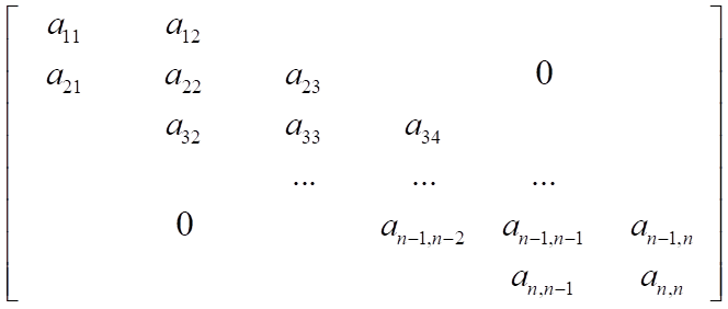 带状矩阵的定义是对于n*n的方阵,若它的全部非零元素落在一个以主对角线为中心的带状区域中,这个带状区域包含主对角线, 以及主对角线下面及上面各b条对角线上的元素。