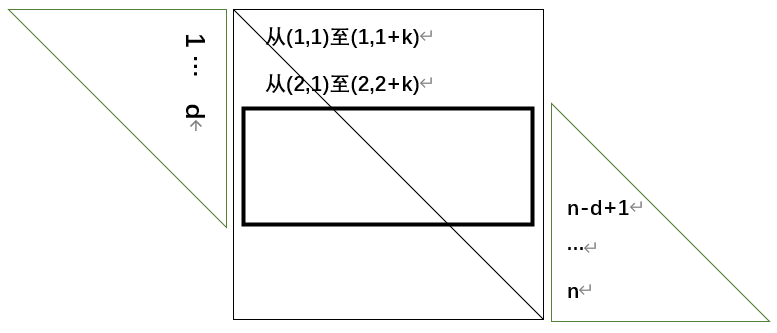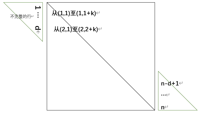 看到这个模型,我还不太知道怎么将其转换为一个通用的压缩公式,最直接的办法就是将其分类讨论,第一种时是不完整的行(i<=d)、第二种是不完整+完整(i<=n-d)、第三种是不完整+完整+不完整(i>n-d)