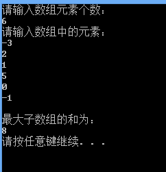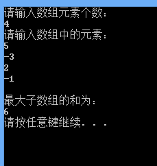 #include"stdafx.h" #include "iostream" using namespace std; int main() { int length;//定义数组长度length int n;//定义变化后的数组的长度 cout<<"请输入数组元素个数:"<<endl; cin>>length; n=2*length; int* a=new int[n];//初始化数组 cout<<"请输入数组中的元素:"<<endl; for(int i=0;i<length;i++) { cin>>a[i]; } int max=a[0]; int s=0;//定义求和后的元素 for(int i=0;i<length;i++) { s=0; for(int j=i;j<length+i;j++) { s=s+a[j]; if(s>max) { max=s; } } a[length+i]=a[i]; //每次将已经计算过的数放到最后 } cout<<endl; cout<<"最大子数组的和为:"<<endl; cout<<max<<endl; return 0; }