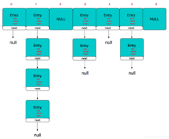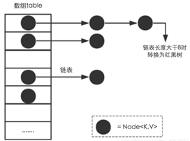 - JDK1.7:数组+链表;JDK1.8:数组+链表+红黑树(链表长度大于8且table大于64转为红黑树,红黑树节点个数小于6转为链表)