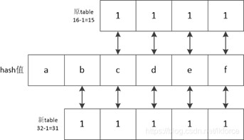 e.hash & oldCap,就是用于计算位置b到底是0还是1用的,只要其结果是0,则新散列下标就等于原散列下标,否则新散列坐标要在原散列坐标的基础上加上原table长度。
