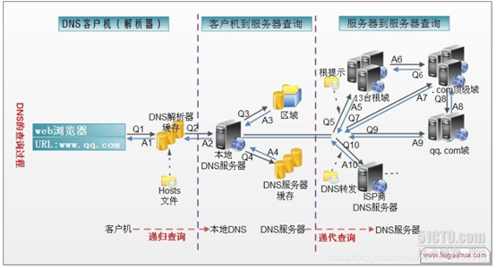 - 顶级域名服务器收到请求后查看区域文件记录,若无则将其管辖范围内主域名服务器的IP地址告诉本地DNS服务器;