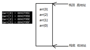 高低地址:在内存中,栈是向下生长的,以char arr[4]为例,(因为char类型数据只有一个字节,不存在字节序的问题)依次输出每个元素的地址,可以发现,arr[0]的地址最低,arr[3]的地址最高。