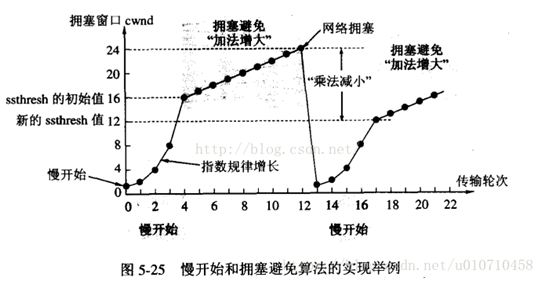 - 当cwnd=24时,网络出现超时,发送方收不到确认ACK,此时设置ssthresh=12(二分之一cwnd),并设置cwnd=1,然后重新开始慢启动算法,当cwnd = ssthresh = 12,慢启动算法变为拥塞控制算法,cwnd按照线性的速度进行增长。
