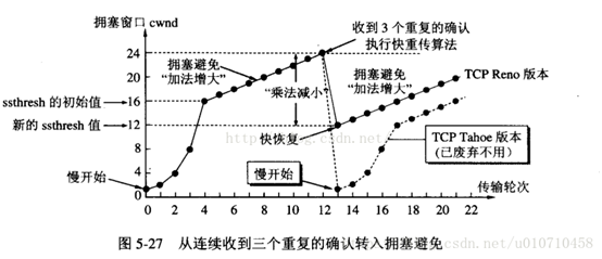 当发送发连续接收到三个确认时,就执行乘法减小算法,把慢启动开始门限(ssthresh)减半,但是接下来并不执行慢启动算法,而是把cwnd设置为ssthresh的一半, 然后执行拥塞避免算法,使拥塞窗口缓慢增大,这就是快速恢复算法。