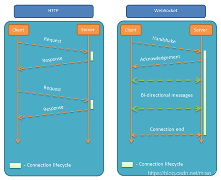 WebSocket在建立握手时,数据是通过HTTP传输的。但是建立之后,在真正传输时候是不需要HTTP协议的。