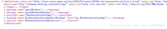 第四步:测试服务是否发布成功,通过阅读wsdl,确定客户端调用的接口、方法、参数和返回值存在,证明服务发布成功 //我们在浏览器输入 http://127.0.0.1:12345/weather?wsdl,只要能获取到,就能确定WebService服务发布成功 |
