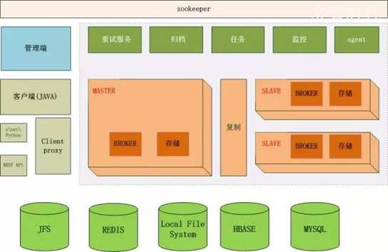 针对公司的业务特点,消息服务主要应用于订单、支付、物流等环节。服务端采用MASTER-SLAVE结构,消息在正常情况下会同时存放两份,其中一份会强制持久化到磁盘,磁盘做RAID-5。默认情况下客户端采用同步发送,每条消息到达服务端MASTER后会强制刷入磁盘同时并行推送一份到SLAVE上,SLAVE写入文件系统后不等待强制刷盘就反馈给MASTER。根据不同的场景为了提高服务的可用性,普通级别的消息SLAVE断开后,该组服务可以正常使用,当SLAVE连接上后又会自动切换为保存两份。当然对数据可靠级别高的消息是强制要求数据必须写两份才算成功的。