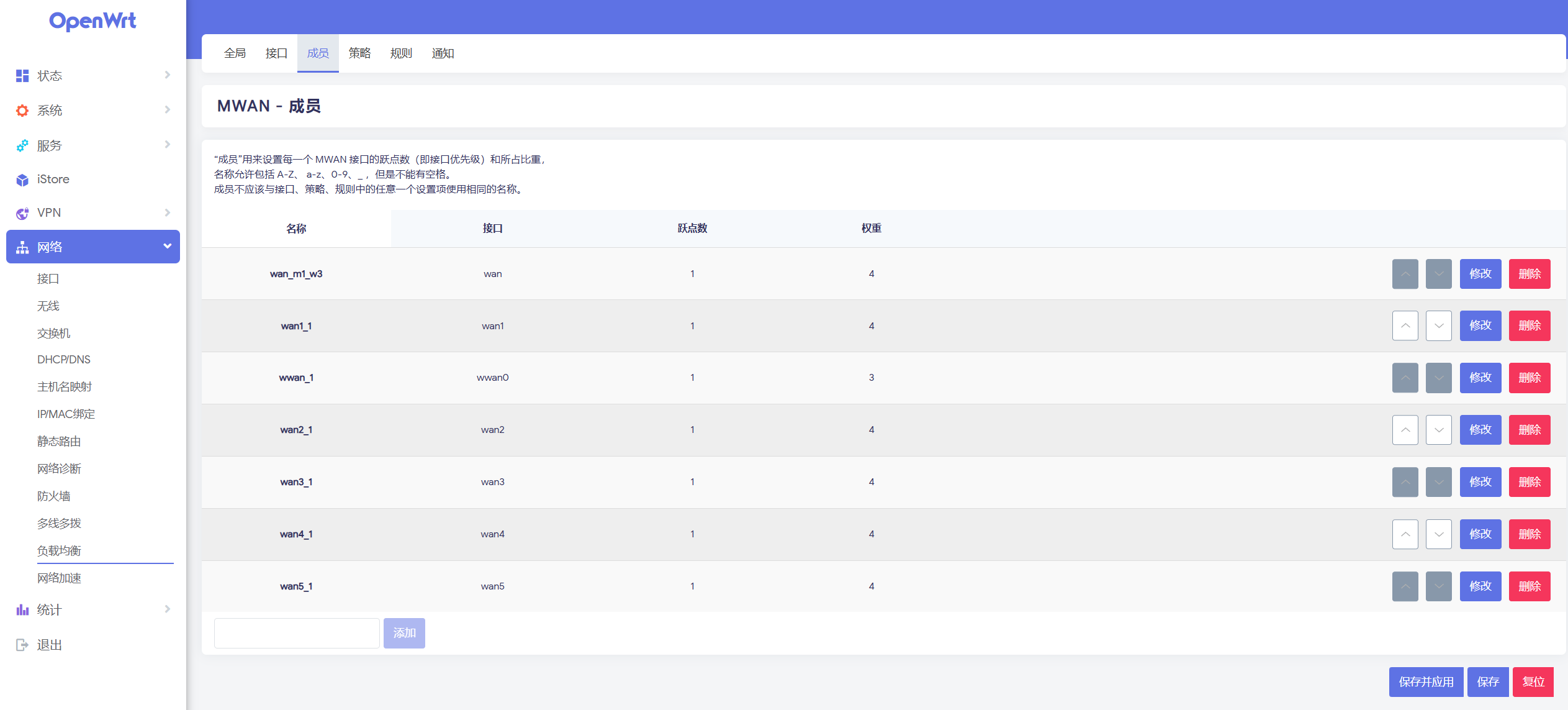 进入“网络-负载均衡-成员” 界面,在输入框添加新的成员,并分别绑定到各个接口,并为这些成员设置相同的跃点数和权重(具体权重分配可自行根据实际调整,只要跃点数相同即可)。