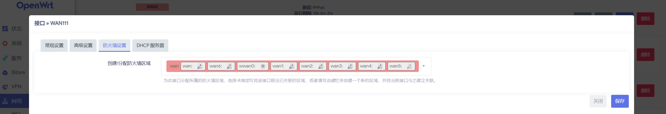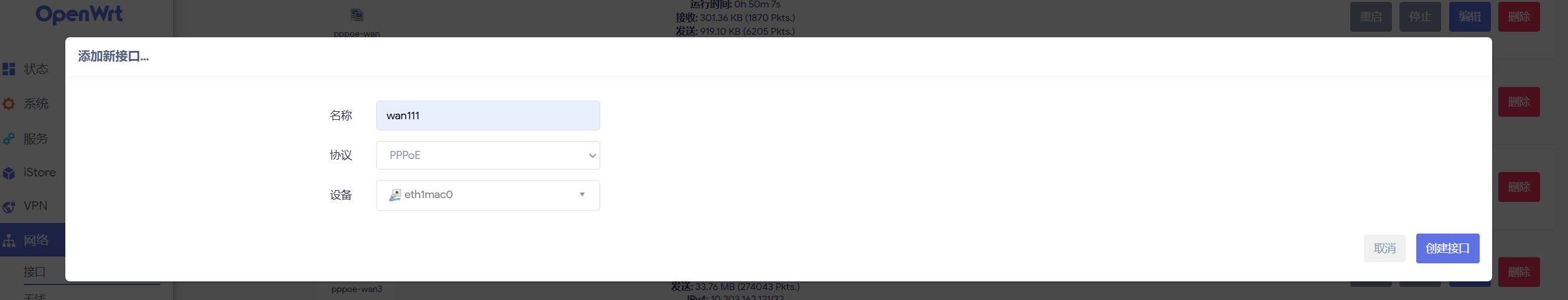 进入“网络-接口-接口”界面,选择页面底部的“添加新接口”,协议选择 PPPoE,设备选择之前创建的 MAC VLAN设备,创建接口。在弹出的配置界面中输入宽带的账号密码,在“防火墙设置”中将新接口分配到 WAN 区域。