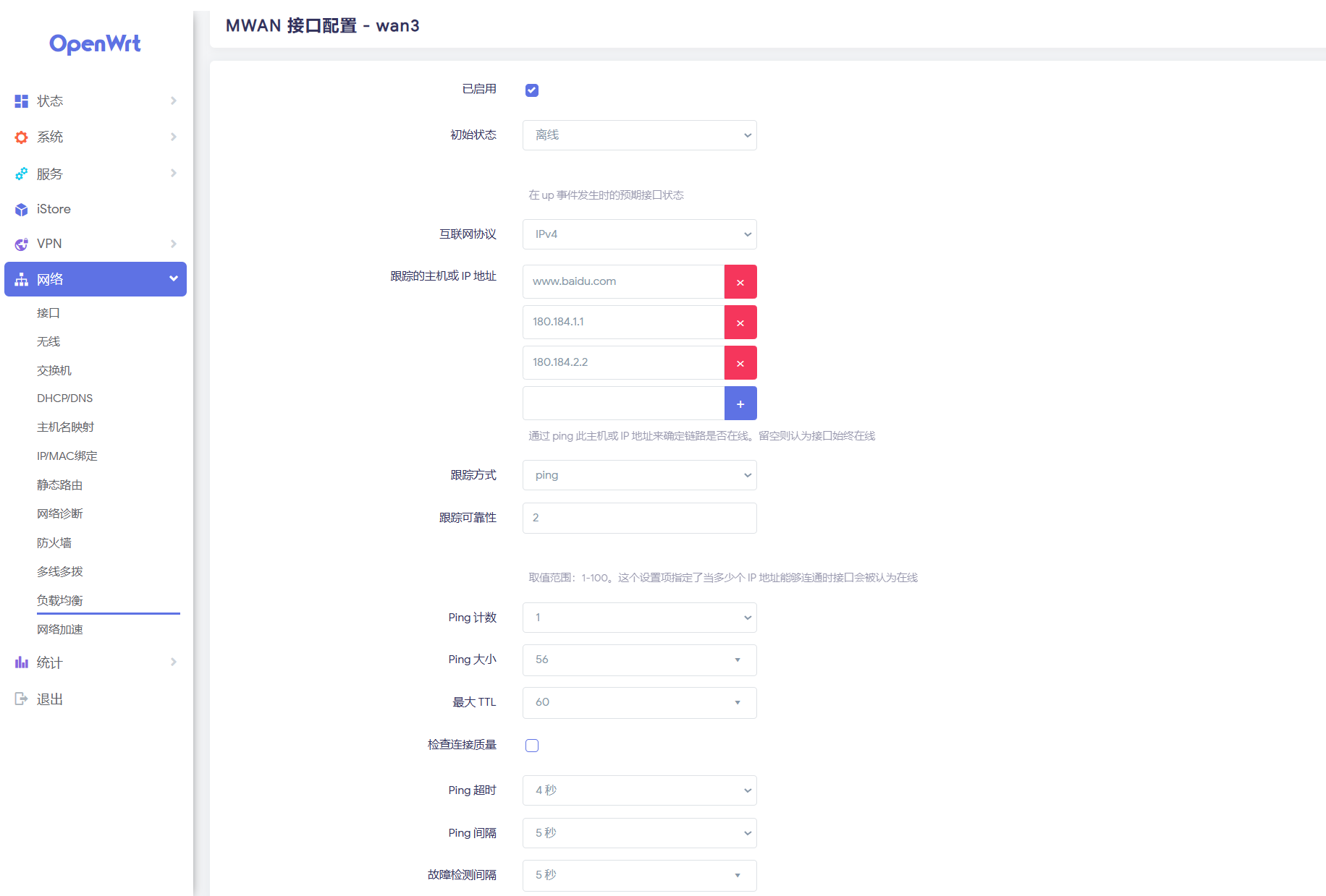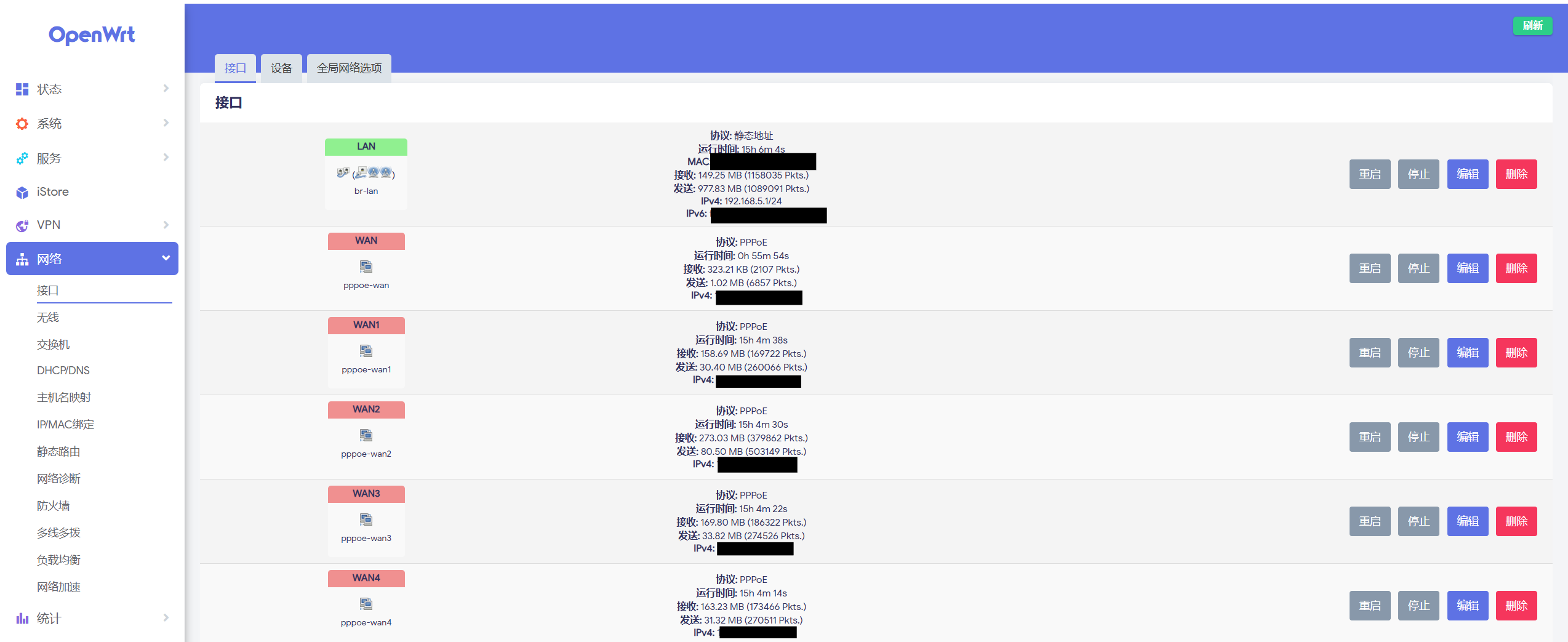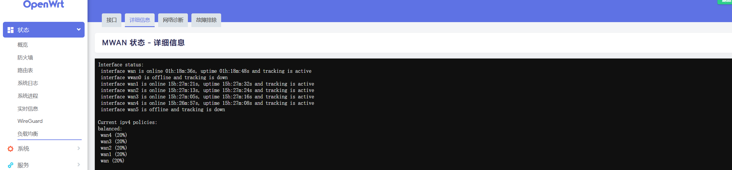 配置都完成并保存后可以回到“网络-接口-接口”界面,重启各个 WAN 口,观察能否正常拨号并分配到 IP 地址。也可在“状态-负载均衡-详细信息”界面中观察各接口状态是否正常。