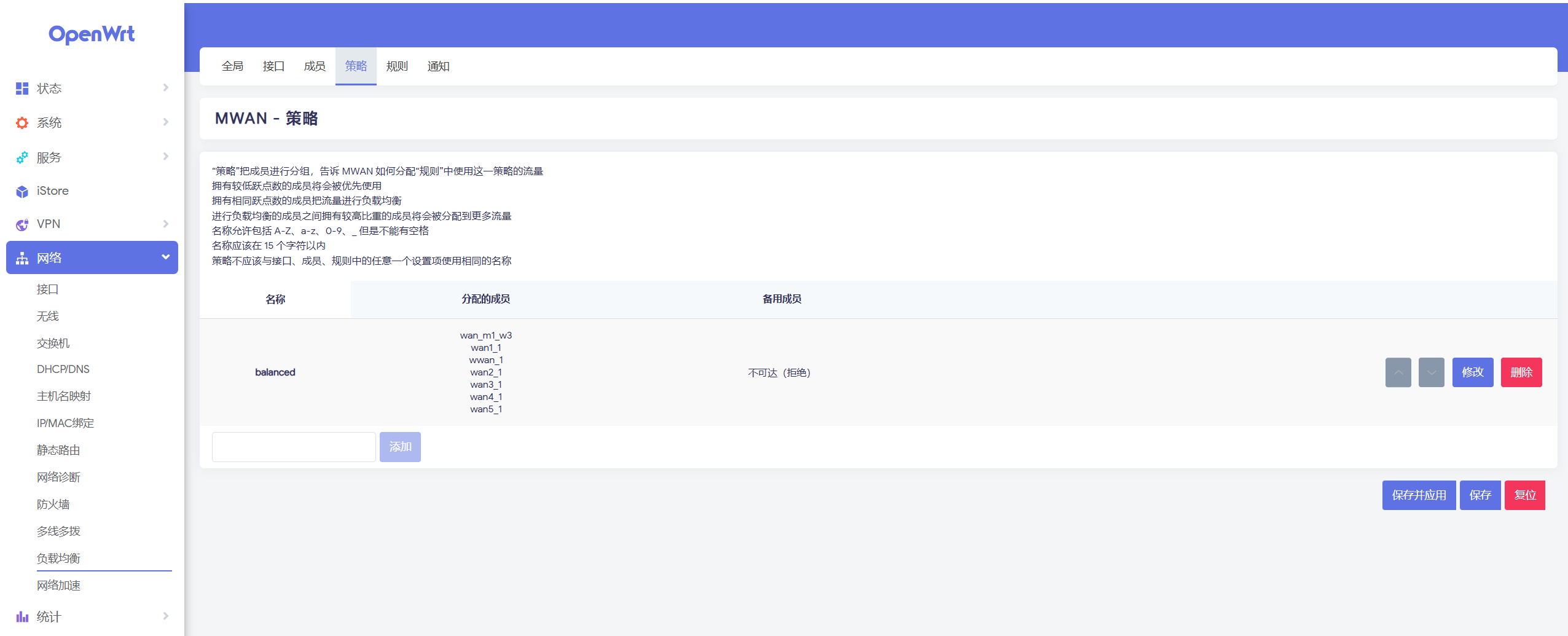进入“网络-负载均衡-策略” 界面,如无特殊需求的话可以将所有成员都添加到 balanced 策略中。