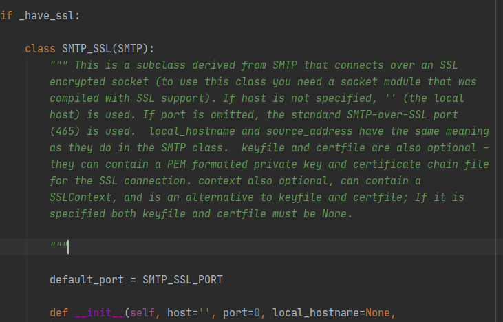 查找smtplib.SMTP_SSL的源码,发现SMTP_SSL类是在have_ssl为True时才成立,而have_ssl这个变量需要ssl的依赖才为True,那么问题找到了,linux上并没有ssl依赖