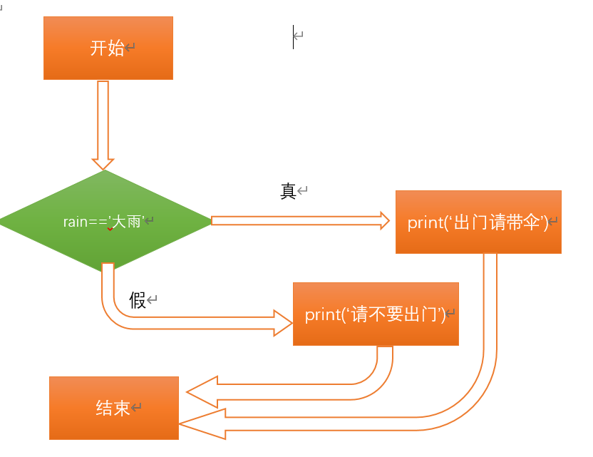 import time print('-'*25+'请问下雨吗?'+'-'*25) rain =input('请您输是否下雨(是或否):') if rain=='是': print('*'*5+'请问您有伞吗?'+'*'*5) san=input('请您输入是否有伞') if san=='有': print('您能外出!') elif san=='没有': while True: print('*'*5+'等一小会?'+'*'*5) time.sleep(5) print('*'*5+'这会还下雨?'+'*'*5) rain1 =input('请输入') if rain1=='没有': print('您能外出了!') break else: pass else: print('可以外出!')