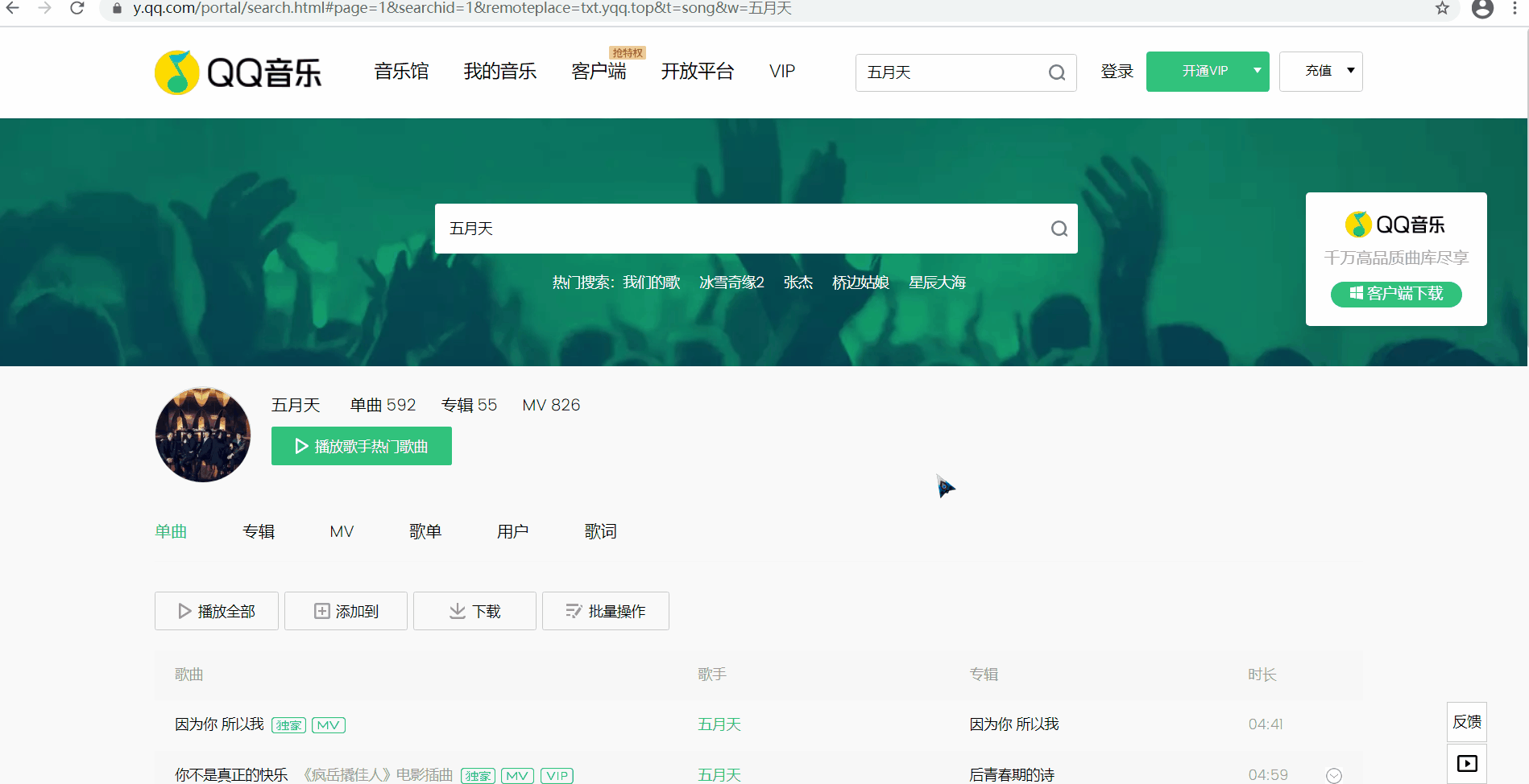 """ 1、爬取qq音乐五月天的歌曲信息 2、歌曲名、播放时间、链接等数据 3、至少爬取三到五页的内容 4、使用的模块:requests """ # 导入库 import requests def send_request(url): headers = { "user-agent": "Mozilla/5.0 (Windows NT 10.0; Win64; x64) AppleWebKit/537.36 (KHTML, like Gecko) Chrome/88.0.4324.104 Safari/537.36"} res = requests.get(url, headers=headers) json_music = res.json() list_music = json_music['data']['song']['list'] for music in list_music: print('歌名:' + music['name']) # 以name为键,查找歌曲名 print('所属专辑:' + music['album']['name']) # 查找专辑名 print('播放时长:' + str(music['interval']) + '秒') # 查找播放时长 print('播放链接:https://y.qq.com/n/yqq/song/' + music['mid'] + '.html\n\n') # 查找播放链接 # 主函数 def main(): for i in range(1, 4): url = 'https://c.y.qq.com/soso/fcgi-bin/client_search_cp?ct=24&qqmusic_ver=1298&new_json=1&remoteplace=txt.yqq.song&searchid=71026466913918890&t=0&aggr=1&cr=1&catZhida=1&lossless=0&flag_qc=0&p={}&n=10&w=%E4%BA%94%E6%9C%88%E5%A4%A9&g_tk_new_20200303=5381&g_tk=5381&loginUin=0&hostUin=0&format=json&inCharset=utf8&outCharset=utf-8¬ice=0&platform=yqq.json&needNewCode=0'.format( i) send_request(url) if __name__ == '__main__': main() print('爬取完成')