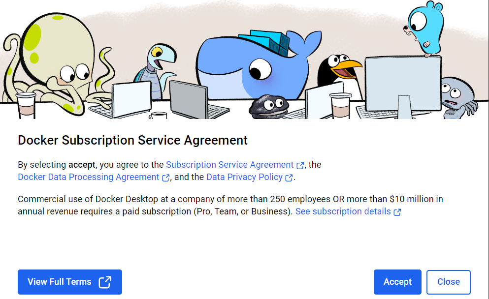 关闭后,找到桌面已安装的Docker DeskTop,双击启动,自动弹出接受服务协议