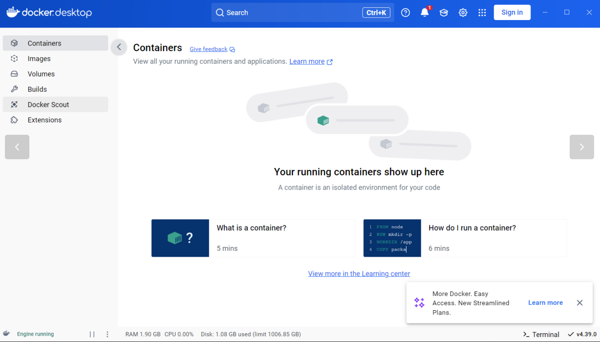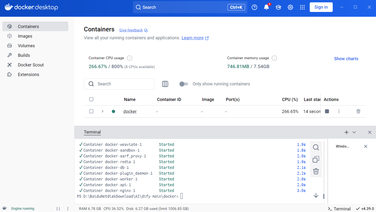 找到桌面docker desktop应用,右键管理员运行启动。docker启动并进入docker desktop应用,左下角能看到 Engine running的状态。
