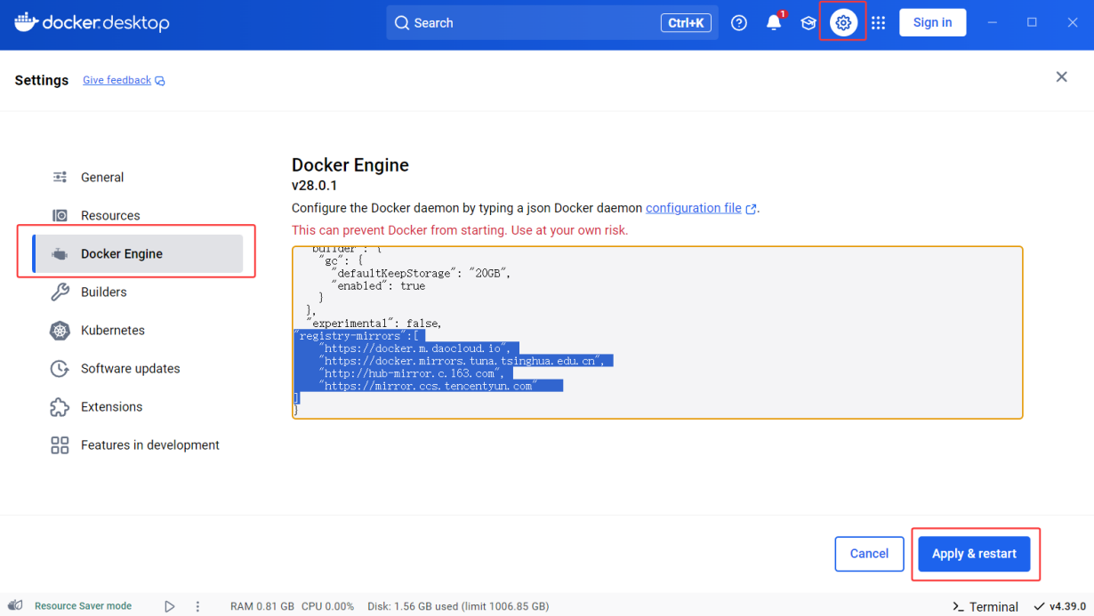 - 右上角设置 - Docker Engine,新增如下内容,点击Apply & restart