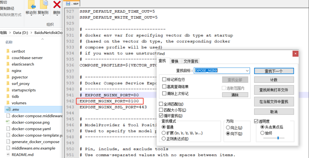 继续找EXPOSE_NGINX_PORT和EXPOSE_NGINX_SSL_PORT配置项,默认值也是80和443,这两个配置项是dify对外映射的两个端口,这两个值必须更改,我这改成了8100和6443: