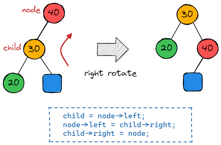 其中,右旋操作及其代码如下图所示,由于蓝色节点在旋转前位于 node 节点的左子树,根据 BST 树的性质,蓝色节点上的值均小于 node 节点,故在旋转后其位于 node 节点的左子树,以保持 BST 树的性质: