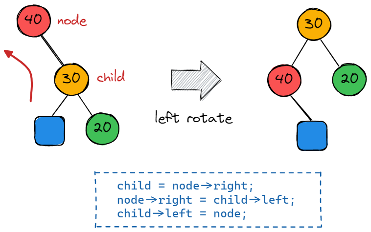 其左旋操作的示意图如下所示,与右旋操作类似,由于蓝色节点在旋转之前位于 node 节点的右子树,所以其值均大于 node 节点,所以在旋转后应将其放置于 node 节点的右子树上以维持 BST 树的性质: