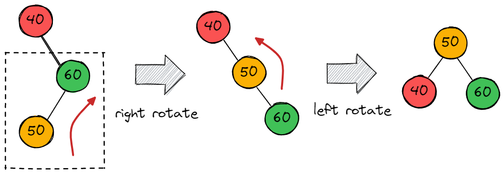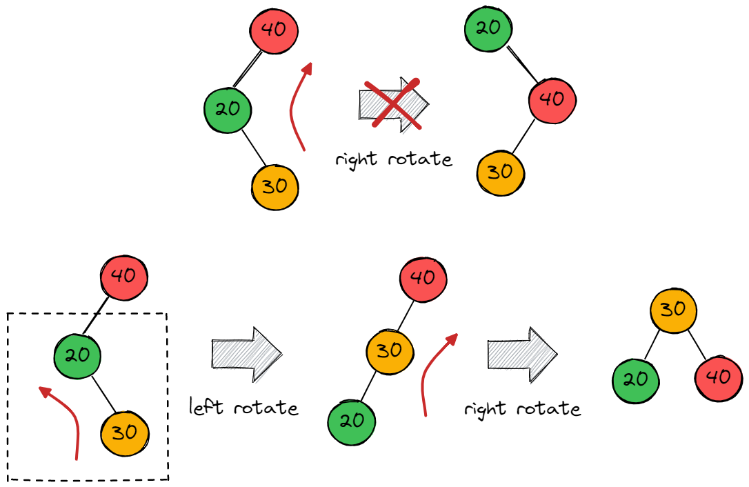 当左孩子的右子树太高时,如果我们只做一次右旋操作,那么依然无法将其变为平衡树,因此此时我们需要做两次旋转操作,先对左子树局部进行左旋操作,然后对整体进行一次右旋操作,如下图所示: