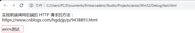 <head> <script src="axios.min.js"></script> </head> <body> <p id="demo22">aaa</p> <script> axios.get('http://127.0.0.1:8080') .then(function(response){ //请求成功 document.getElementById("demo22").innerHTML = response.data; }).catch(function(erroe){ //请求失败 document.getElementById("demo22").innerHTML='请求失败' }); </script> </body> </html>