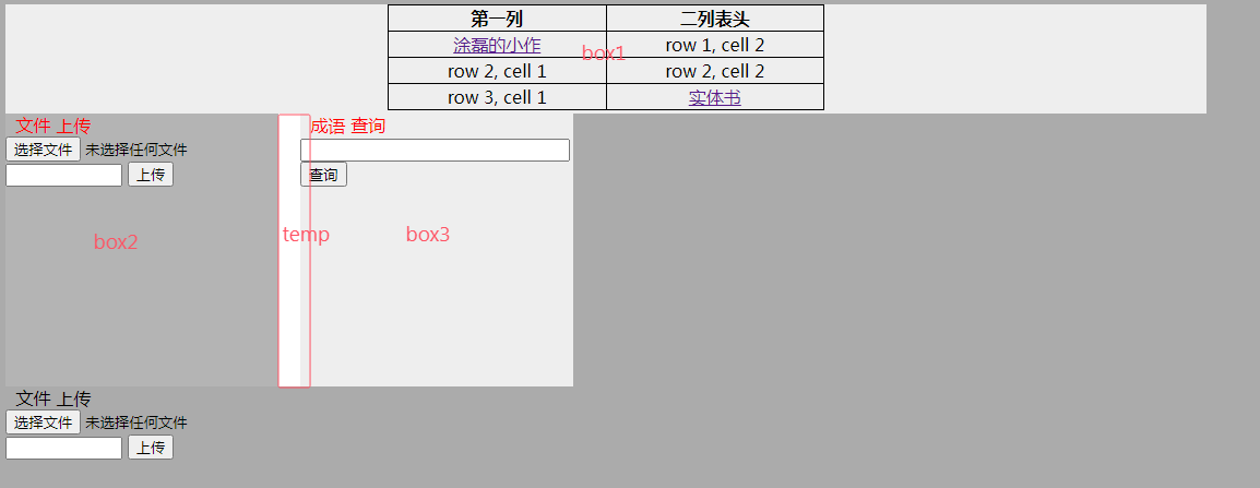 <!DOCTYPE html> <html lang="en"> <head> <meta charset="UTF-8"> <title>tulater_webBroker全功能展示</title> </head> <body bgcolor="#ababab" > <div id="all" > <!-----------------------------静态 表格------------------------------> <div id="box1" style="background: #eee;width:1100px;height:100px;"> <style> table { width: 400px; margin: 0 auto; border: 1px solid #000000; border-collapse: collapse; } th, td { border: 1px solid #000000; text-align: center; } </style> <table border="1"> <tr> <th>第一列</th> <th>二列表头</th> </tr> <tr> <td><a target="_blank" href="http://www.cnblogs.com/tulater">涂磊的小作</a></td> <td>row 1, cell 2</td> </tr> <tr> <td>row 2, cell 1</td> <td>row 2, cell 2</td> </tr> <tr> <td>row 3, cell 1</td> <td><a target="_blank" href="https://www.cnblogs.com/tulater/p/18519255">实体书</a></td> </tr> </table> </div> <!-----------------------------------------------------> <!----------------------------文件 上传------------------------------> <div id="box2" style=" background:#eee1;width: 250px;height:250px;float:left;">   <font color="#ff0000">文件 上传</font><br> <form action="upload" method="post" enctype="multipart/form-data"> <input type="file" size="60" name="myfile"> <input type="text" size="10" > <input type="submit" value="上传"> </form> </div> <!---------------------------------中间 间隔------------------> <div id="temp1" style=" background:white;width: 20px;height:250px;float:left;"> </div> <!----------------------------成语 查询------------------------------> <div id="box3" style=" background:#eeef;width: 250px;height:250px;float:left;">   <font color="#ff0000">成语 查询</font><br> <form action="upload" method="post"> <input type="text" size="30" name="html" > <input type="submit" value="查询"> </form> </div> <!-----------------------------------------------------> <!----------------------------文件 上传------------------------------> <div id="box2" style=" background:#eee1;width: 250px;height:250px;">   文件 上传<br> <form action="upload" method="post" enctype="multipart/form-data"> <input type="file" size="60" name="myfile"> <input type="text" size="10" > <input type="submit" value="上传"> </form> </div> <!-----------------------------------------------------> </div> </body> </html>