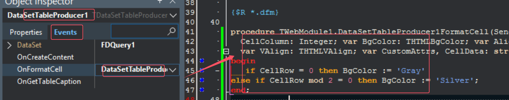 procedure TWebModule1.DataSetTableProducer1FormatCell(Sender: TObject; CellRow, CellColumn: Integer; var BgColor: THTMLBgColor; var Align: THTMLAlign; var VAlign: THTMLVAlign; var CustomAttrs, CellData: string); begin if CellRow = 0 then BgColor := 'Gray' else if CellRow mod 2 = 0 then BgColor := 'Silver'; end;