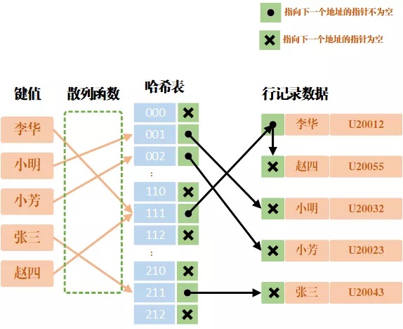 上图是通过哈希索引查询行数据的示意图,可以发现哈希索引同样会发生哈希冲突,并且是通过链地址法解决冲突的。当发送冲突时,还需要对链表进行遍历对比,才能够找到最终的结果。