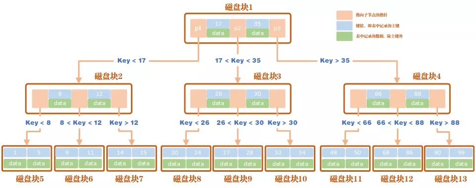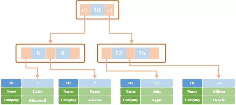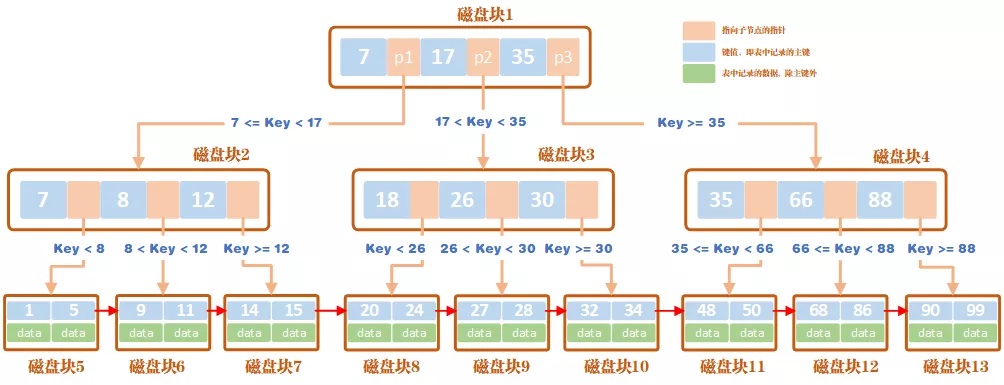 上图实际上是一种带有顺序索引的 B+Tree,与最基本的 B+Tree 的区别就在于叶子节点是否通过指针相连。一般数据库中常用的结构都是这种带有顺序索引的 B+Tree。后文探讨的也都是带顺序索引的 B+Tree 结构。