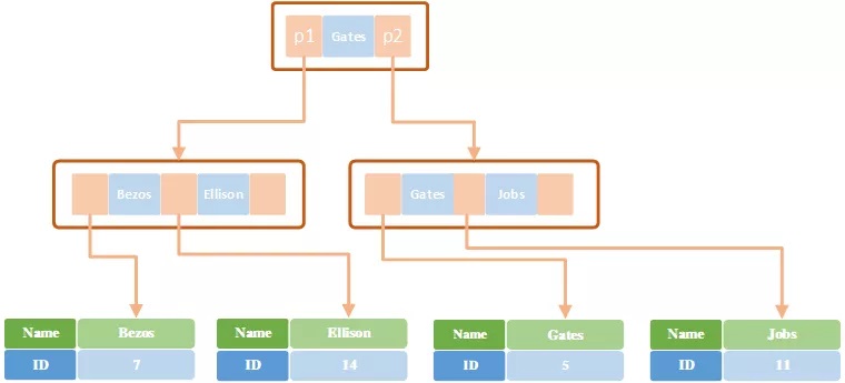 所以当使用where ID = 7这样的条件查找主键,则按照B+树的检索算法即可查找到对应的叶节点,之后获得行数据。对Name列进行条件搜索,则需要两个步骤:第一步在辅助索引B+树中检索Name,到达其叶子节点获取对应的主键。第二步使用主键在主键索引B+树种再执行一次B+树检索操作,最终到达叶子节点即可获取整行数据。