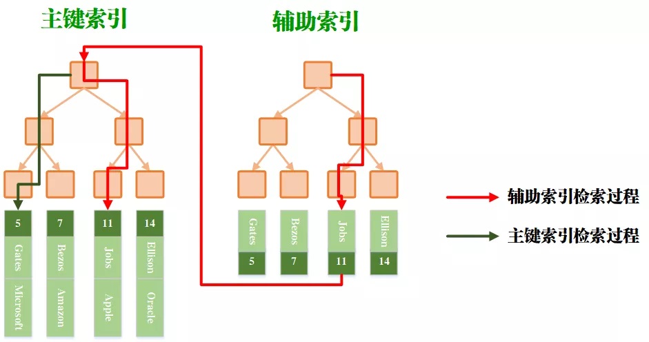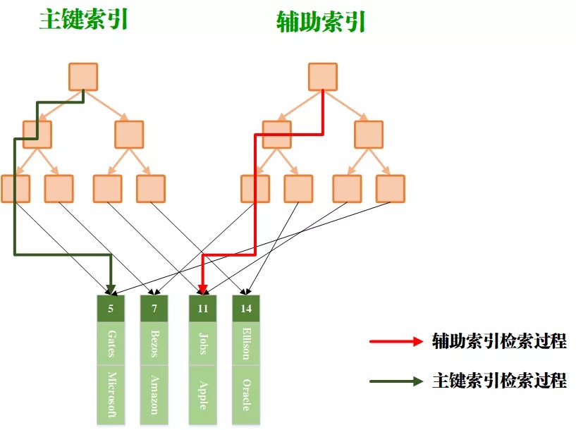 重点来了。当然主键索引和辅助索引一结合,能干啥呢。当直接采用主键进行检索时,可通过主键索引直接获得数据;而当采用非主键进行检索时,先需要通过辅助索引来获得主键,然后再通过这个主键在主键索引中找到对应的数据行。