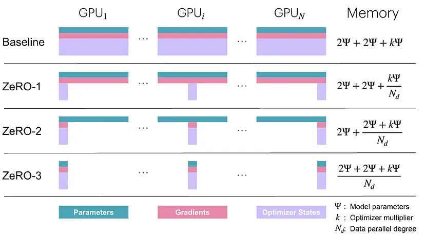 “5D并行性”,这个术语最早是由Meta AI的论文《The Llama 3 Herd of Models》推广开来的。传统意义上,它指的是融合了数据并行、张量并行、上下文并行、流水线并行以及专家并行的技术。不过近来,一种名为ZeRO(零冗余优化器)的新范式横空出世,彻底改变了游戏规则。它通过削减分布式计算中的冗余来优化内存。每项技术都针对训练难题的不同方面,当它们协同发力时,就能处理含有数十亿(甚至数万亿)参数的模型。