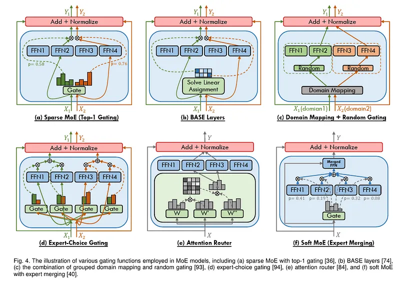 - 动态路由:门控函数动态决定每个输入令牌或数据片段应由哪些专家处理。