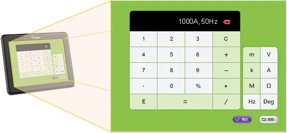 TD1000装置具有“定点输出”方式,通过点击触摸屏,直接设置所需输出的量值,装置将全自动切换至最佳量程输出,使得校准数字式仪表变得非常方便。特别是在设定交流电压/电流输出时,直接同时输入幅值和频率即可,使用十分便捷。