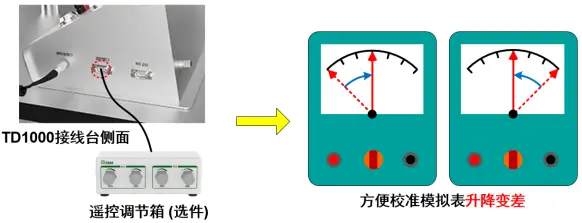 为此我们为用户提供了遥控调节箱(选配件),通过粗调—细调的操作,能迅速将输出调节至与被检表刻度对齐,非常方便完成模拟表的检定。特别是当需要考虑到移动时的摩擦或迟滞效应时,此功能尤其有用。