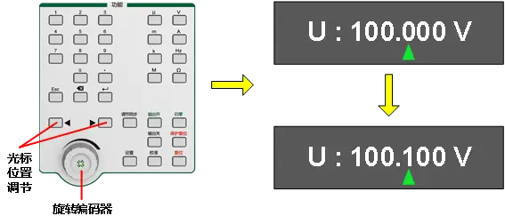 三用表校验仪TD1850仪器前面板上配置了“旋转编码器”,点击左右方向键调节光标位置后,再通过顺时针或逆时针旋转来增大或减小量值输出。
