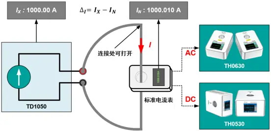 打开电流输出铜环的连接处,将标准电流表接入电流输出回路中,即可实现对交直流电流源的校准。标准电流表可选用TH0630(校准交流电流)和TH0530(校准交直流电流)。