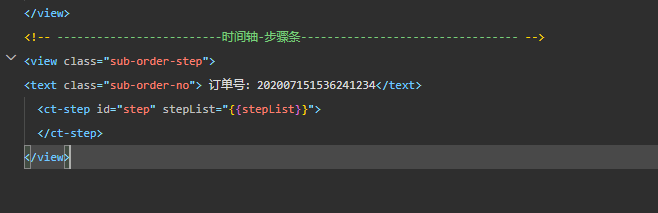 1 <!--components/Step/step.wxml--> 2 <view class="ct-wx-step"> 3 <view class='ct-wx-cell-list' wx:key="{{item}}" wx:for="{{stepList}}"> 4 <view class='ct-wx-cell-point {{item.status==0?"default":"piont-last"}} '></view> 5 <view class='ct-wx-cell-line {{item.status==1?"last":null}}'> 6 <view class='ct-wx-cell-name'>{{item.name}}</view> 7 <view class='ct-wx-cell-event'>{{item.event}}</view> 8 <view class='ct-wx-cell-time'>{{item.time}}</view> 9 </view> 10 </view> 11 </view>